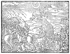 Description: Israel defeats the Amorites at Gibeon with the help of God, who rains down stones upon the Amorites and causes the sun and the moon to stand still. Illustration by Pierre Eskrich (ca. 1550-ca. 1590).