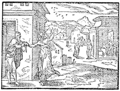 Description: Micah returns the silver he took from his mother (foreground), and she has it made into an idol (background).. Illustration by Pierre Eskrich (ca. 1550-ca. 1590).