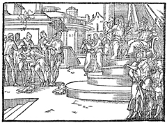 Description: When David shows sympathy for the death of Hanun’s father, Hanun seizes David’s men and shaves half of their beards and cut off their lower garments. Illustration by Pierre Eskrich (ca. 1550-ca. 1590).