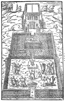 Description: A rendering of the exterior of the temple with the courtyard. Illustration by Pierre Eskrich (ca. 1550-ca. 1590).