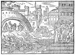 Description: Nebuchadnezzar has Shadrach, Meshach, and Abednego thrown into the fiery furnace for not bowing to the idol, but an angel appears to protect them. Illustration by Pierre Eskrich (ca. 1550-ca. 1590).