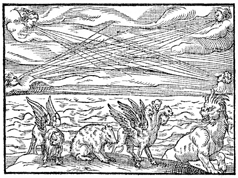 Description: As the four winds blow upon the waters, out of the sea emerge four beasts: one with the head of a lion and wings of the eagle; a second was in the form of a bear and had three ribs in its mouth; the third beast had four heads and four wings; and the fourth beast had long teeth, multiple horns, and hooves like those of an ox. Illustration by Pierre Eskrich (ca. 1550-ca. 1590).