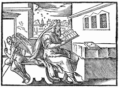 Description: A rendering of Matthew writing his gospel, and an angel with pen and ink well suggesting inspiration. Illustration by Pierre Eskrich (ca. 1550-ca. 1590).
