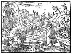 Description: Jesus is tempted by Satan in the wilderness. Illustration by Pierre Eskrich (ca. 1550-ca. 1590).