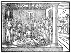 Description: Jesus heals the paralytic as his friends lower him from the roof above. In the background, the paralytic carries his mat home. Illustration by Pierre Eskrich (ca. 1550-ca. 1590).