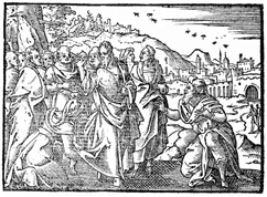 Description: The woman with the issue of blood touches the hem of Jesus’ garmet while Jairus asks Jesus to heal his sick daughter. Illustration by Pierre Eskrich (ca. 1550-ca. 1590).