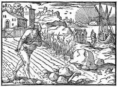 Description: Jesus tells the parable of the sower from a boat while the action is displayed in the foreground. Illustration by Pierre Eskrich (ca. 1550-ca. 1590).