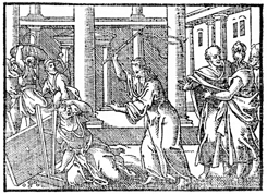 Description: Jesus drives the moneychangers out of the temple with a whip. Illustration by Pierre Eskrich (ca. 1550-ca. 1590).