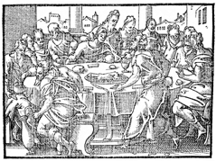 Description: Jesus celebrates the Passover meal with his disciples. Illustration by Pierre Eskrich (ca. 1550-ca. 1590).