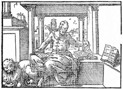 Description: A rendering of John Mark writing his gospel with his attribute the lion alongside. Illustration by Pierre Eskrich (ca. 1550-ca. 1590).
