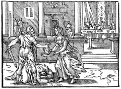 Description: John the Baptist's head is placed on a platter after his beheading. In the background, Salome dances for Herod and his guests. Illustration by Pierre Eskrich (ca. 1550-ca. 1590).