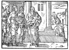 Description: When Mary and Joseph bring the infant Jesus to the temple to present him to the priest, Simeon and Anna bless Jesus in the temple. Illustration by Pierre Eskrich (ca. 1550-ca. 1590).