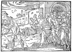 Description: Jesus raises a widow’s son from the dead at Nain. Illustration by Pierre Eskrich (ca. 1550-ca. 1590).