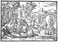 Description: A Samaritan stops to help a man wounded by thieves, while a priest and a Levite pass by. Illustration by Pierre Eskrich (ca. 1550-ca. 1590).