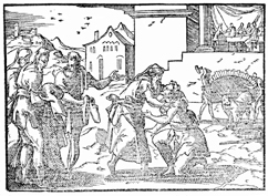 Description: The father embraces his son upon his return home and has the best cow slaughtered to thrown him a banquet. Illustration by Pierre Eskrich (ca. 1550-ca. 1590).