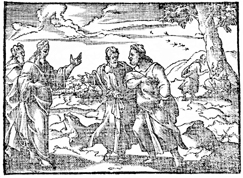 Description: Jesus calls his first disciples, Simon Peter, Andrew, Philip, and Nathanael who is depicted under a tree. Illustration by Pierre Eskrich (ca. 1550-ca. 1590).