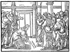 Description: Jesus writes on the ground with his finger during the trial of the adulteress woman. Illustration by Pierre Eskrich (ca. 1550-ca. 1590).