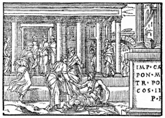 Description: Peter heals the lame man outside the temple. Illustration by Pierre Eskrich (ca. 1550-ca. 1590).