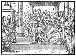 Description: The apostles lay hands on the heads of the seven chosen to distribute food. Illustration by Pierre Eskrich (ca. 1550-ca. 1590).