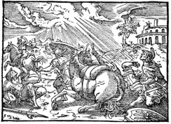 Description: A vision of Jesus blinds Saul as he travels with companions on the road to Damascus. Illustration by Pierre Eskrich (ca. 1550-ca. 1590).
