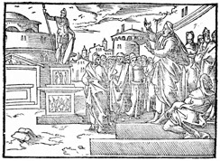 Description: Paul preaches on Mars Hill about Jesus beginning with the statue to the unknown god depicted in the background. Illustration by Pierre Eskrich (ca. 1550-ca. 1590).