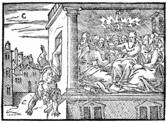 Description: Eutychus falls from the window, having fallen asleep during Paul’s message. Illustration by Pierre Eskrich (ca. 1550-ca. 1590).