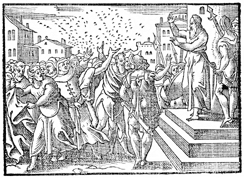 Description: Paul gives his defense to the crowd after receiving permission from the commander of the guard. Illustration by Pierre Eskrich (ca. 1550-ca. 1590).