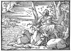 Description: A rendering of the apostle John writing his epistles and receiving inspiration from an angel. Illustration by Pierre Eskrich (ca. 1550-ca. 1590).
