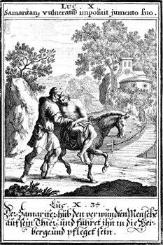 Description: The Good Samaritan places the wounded man on his donkey in order to take him to Jericho.