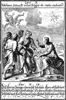 Description: Jesus instructs the seventy before sending them out two by two. The background shows Satan falling from heaven and the names of the disciples being written in heaven by an angel. The disciples trample a snake with their bare feet.