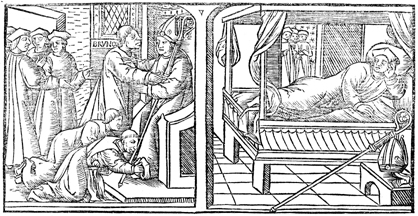 Description: On the left, the Pope's feet are kissed. On the right, the Pope sleeps.