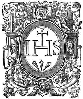 Description: A title page image featuring the device of the Society of Jesus, or the Jesuits, established by Saint Ignatius Loyola.
