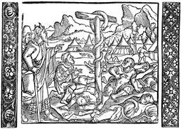 Description: Moses provides a bronze serpent that whoever looks upon it may live from the venomous snake bites.