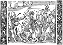 Description: Balaam beats his donkey for stopping as an angel stands in its way with sword raised.