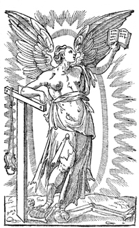 Description: A topless angel stands on a skeleton with the instruments of crucifixion and a Bible in hand.