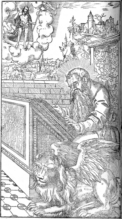 Description: Mark, receiving inspiration from the risen Christ, writes his gospel. His attribute, the lion, is nearby.