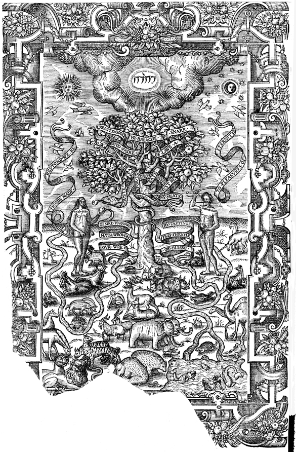 Description: This frontispiece illustrates the present fall and forthcoming redemption of humanity (indicated by the words inscribed upon the banderoles found in each of their hands), as Adam and Eve stand beside the tree of the knowledge of good and evil with the serpent tangled in its branches. The Tetragrammaton (top, center), encircled by a cloud and radiating light, signals the presence of God.