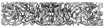 Description: An abundance of viny foliage springs from underneath a mermaid's two tails. Snakes, tulips, and birds appear between the leaves, and under the largest leaves stand two short, imp-like figures.