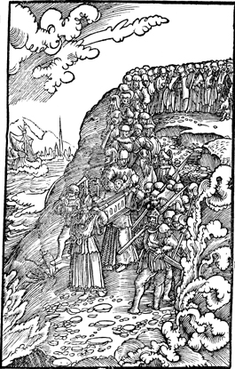 Description: The Israelites cross the Jordan River as the priests hold the Ark of the Covenant in the middle of the river.