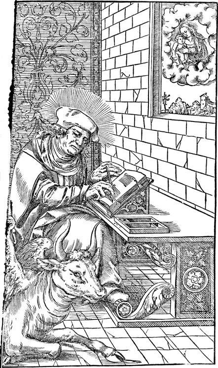 Description: With the Madonna and child in view, Luke writes his gospel. His attribute, the bull, is at his feet.