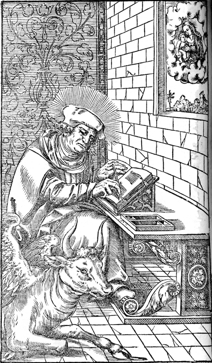 Description: With the Madonna and child in view, Luke writes the book of Acts. His attribute, the bull, is at his feet.