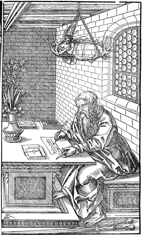 Description: Receiving inspiration from the Man of Sorrows, St. Paul writes an epistle. His attribute, the sword, lies at his feet.