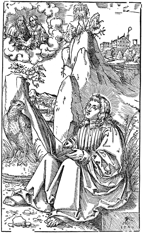 Description: Receiving inspiration from the Trinity, St. John writes a letter. His attribute, the eagle, is nearby.
