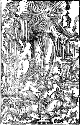 Description: John's vision of the one like a son of man among the seven golden lampstands. John bows at his feet.