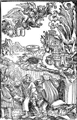 Description: Two angels drop a giant millstone as Babylon (Rome) burns in the background.