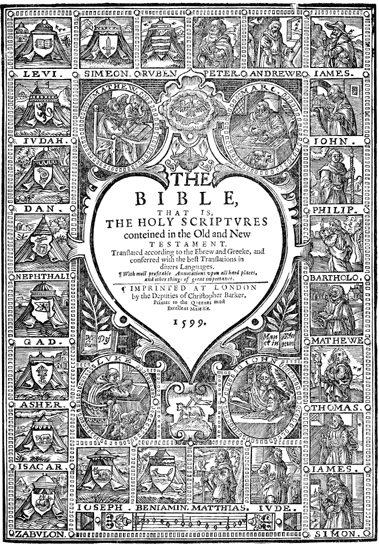 Description: This historiated title page border depicts the tents of the twelve tribes of Israel with their respective coats of arms, the twelve apostles with their attributes, and the four gospel writers with their attributes..
