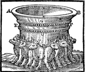 Description: The bronze sea made by Solomon for the temple, including the twelve cast oxen supporting the sea, with three each facing north, south, east, and west.