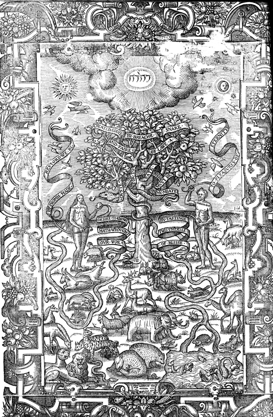 Description: This frontispiece illustrates the present fall and forthcoming redemption of humanity (indicated by the words inscribed upon the banderoles found in each of their hands), as Adam and Eve stand beside the tree of the knowledge of good and evil with the serpent tangled in its branches. The Tetragrammaton (top, center), encircled by a cloud and radiating light, signals the presence of God.