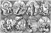 Description: There are eight scenes depicted here from Genesis: God creating the heavens and the earth; God creating the sun, moon and stars; God creating the animals and birds; God creating Adam and Eve; The Serpent tempting Adam and Eve; Adam and Eve being expelled from the Garden of Eden; Noah’s Ark and The Flood; Noah and his family offering a sacrifice after the Flood.