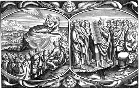 Description: An engraving depicting two scenes at the end of Moses’ life: in the image on the right, Moses delivers his valediction with the stone tablets containing the Ten Commandments tablets. In the image on the left, Moses dies on Mt. Nebo.